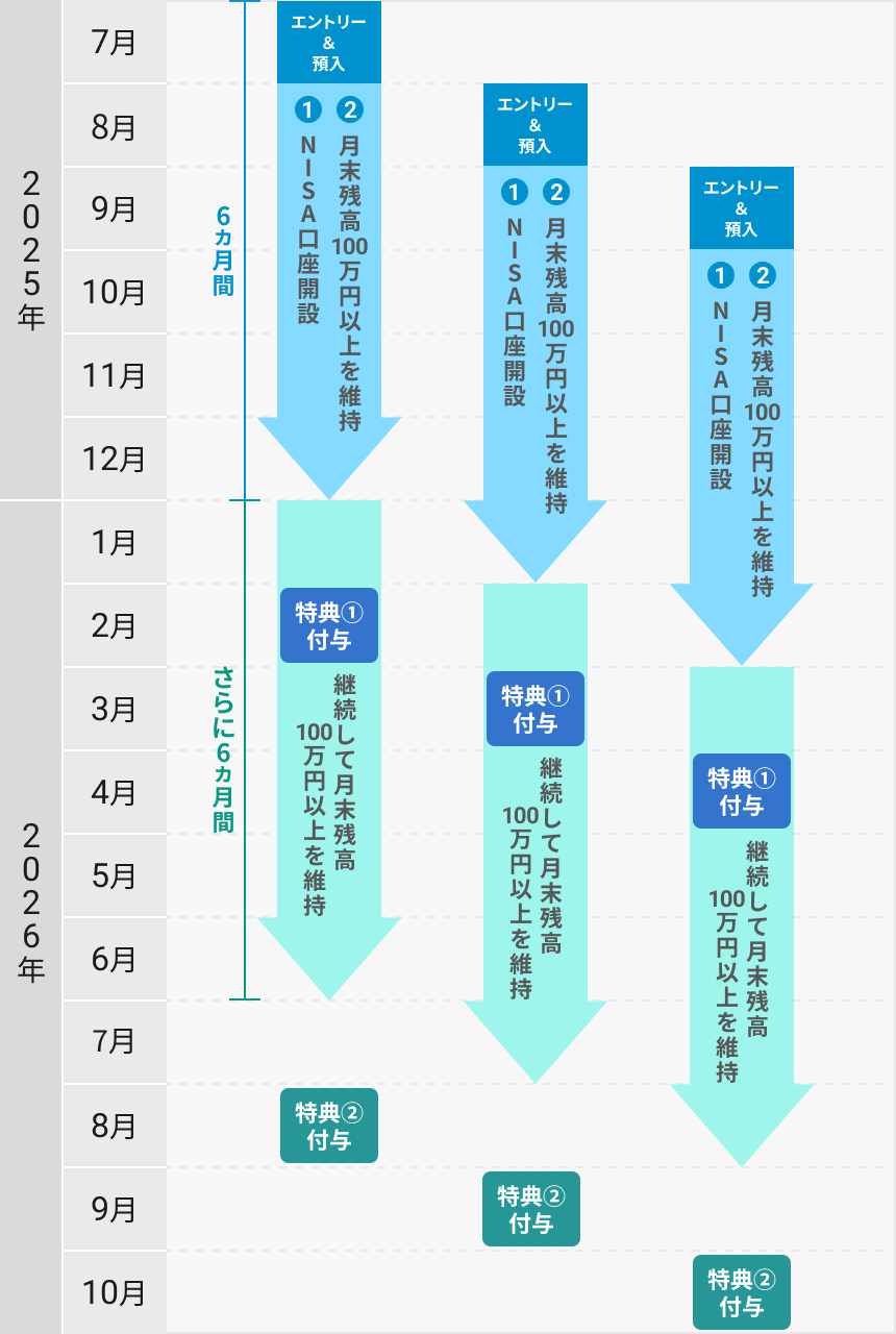 例)預入が7月、エントリーが8月の場合、7~12月のNISA口座開設・月末残高100万円以上維持で特典①の条件達成となります。