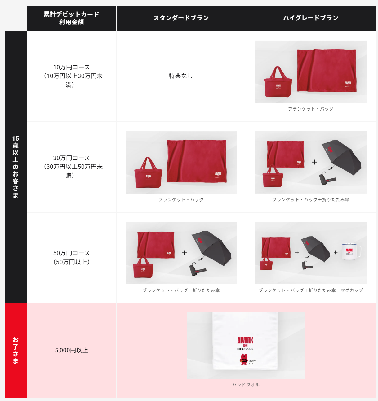 特典:条件を満たしたお客さまに以下の特典をアルバルク東京NEOBANKにご登録の住所宛にお送りいたします