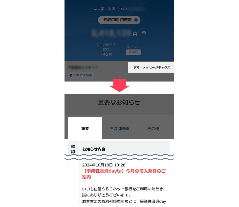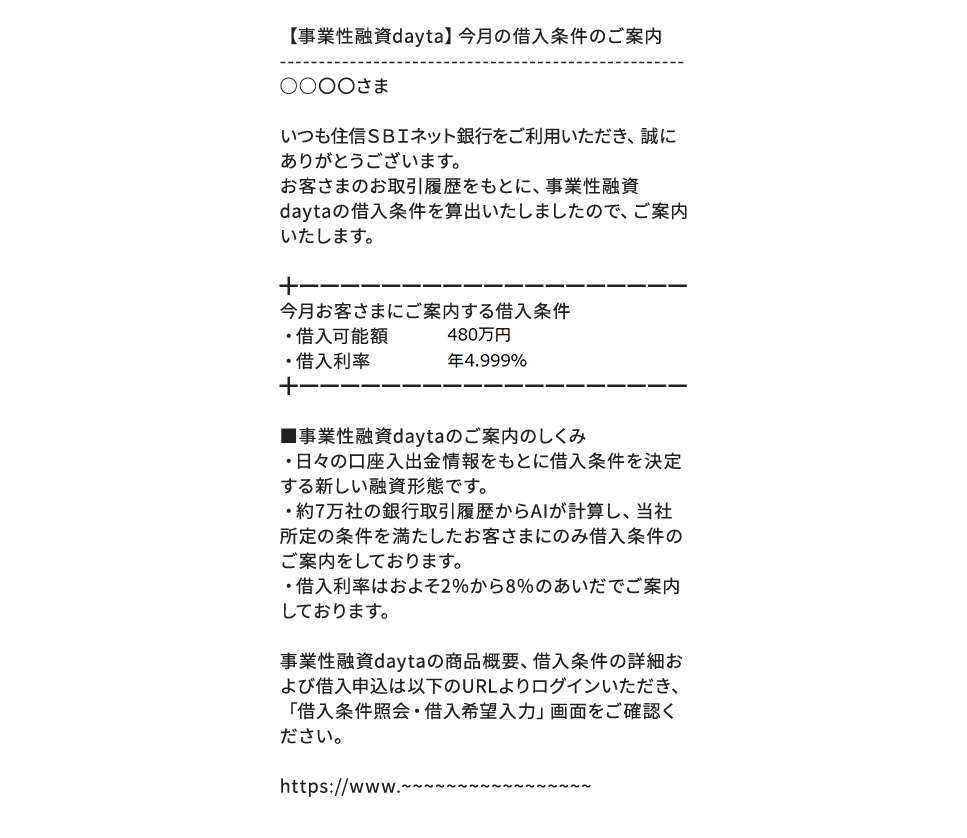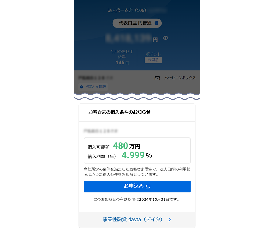 - ※ 借入条件のお知らせは、当社の法人口座を一定期間ご利用いただくなど、当社所定の条件を満たしたお客さまに対してお送りしています。