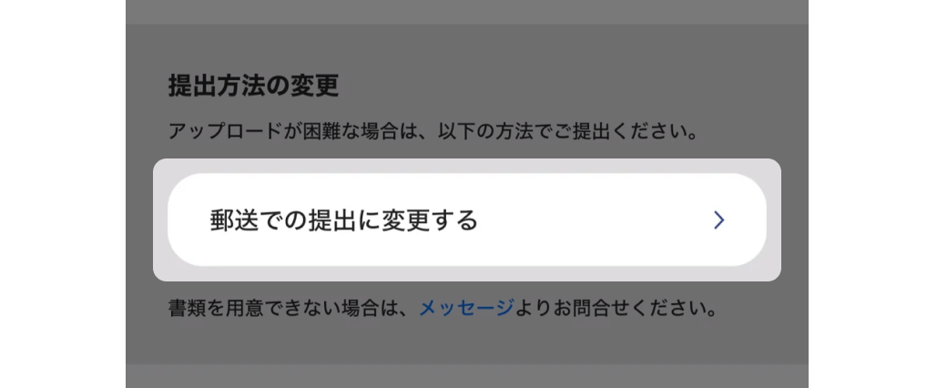 アップロード画面の下部にある「郵送での提出に変更する」ボタンを押して、郵送での提出に切り替えてください。