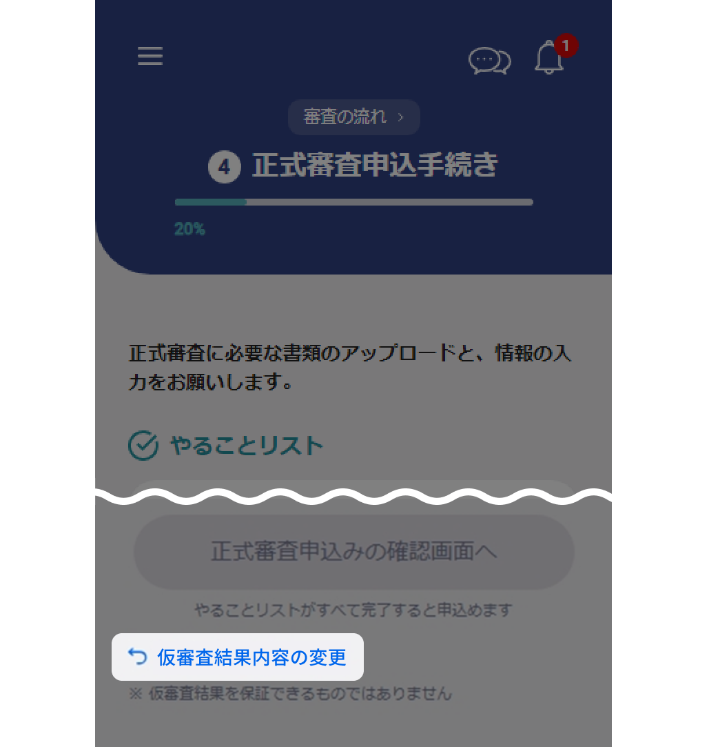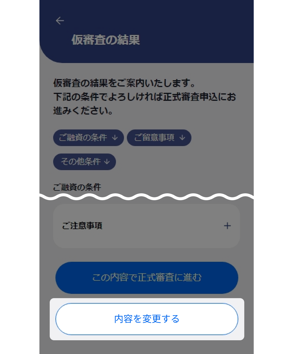 仮審査の結果画面で「この内容で正式審査に進む」ボタンを押したあとに内容変更をしたい場合は、ホーム画面下部に表示されている「仮審査結果内容の変更」リンクを押してください。