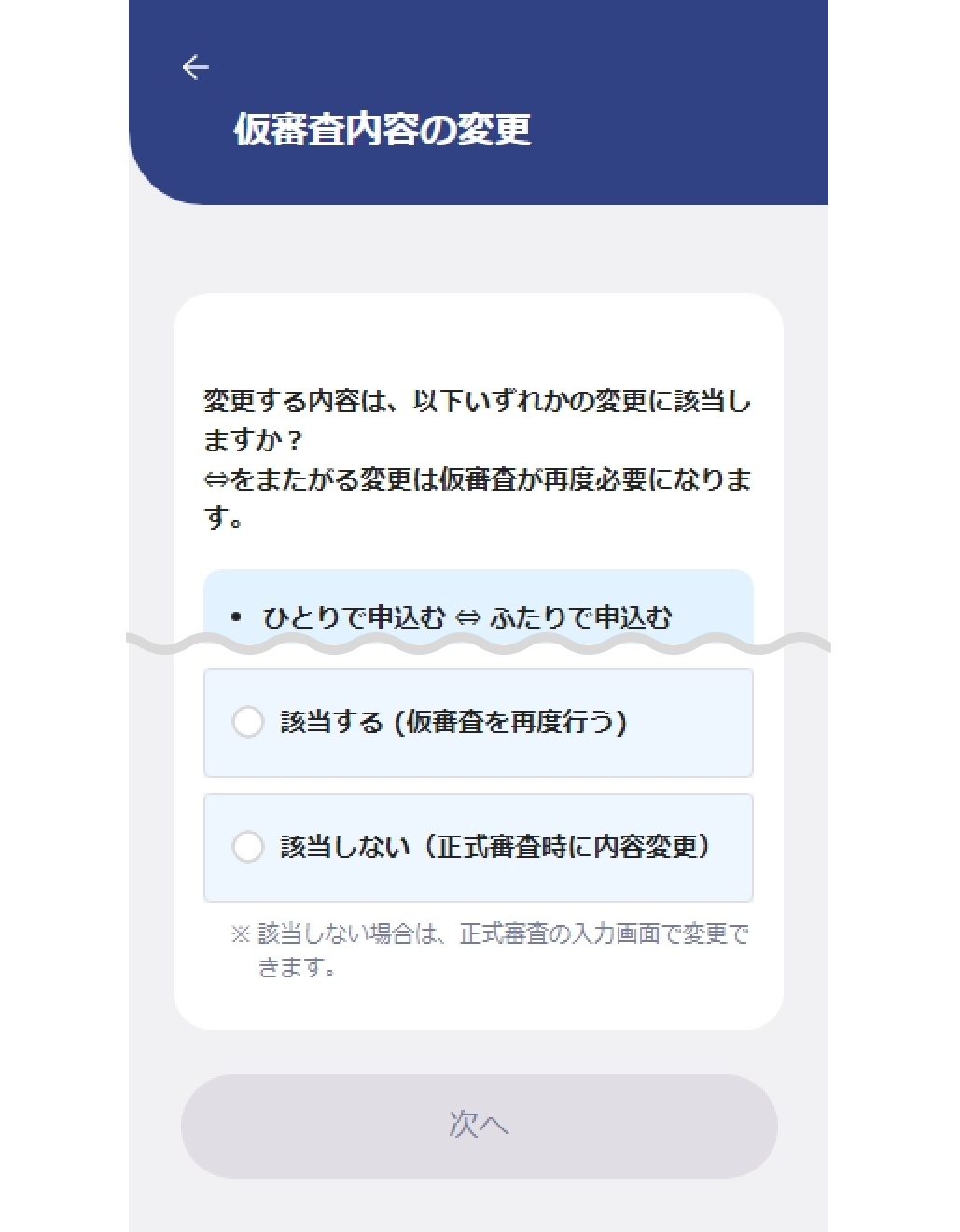 仮審査の結果画面で正式審査に進むにあたり仮審査で申告した内容を変更したい場合は、仮審査の結果画面下部にある「内容を変更する」ボタンを押してください。