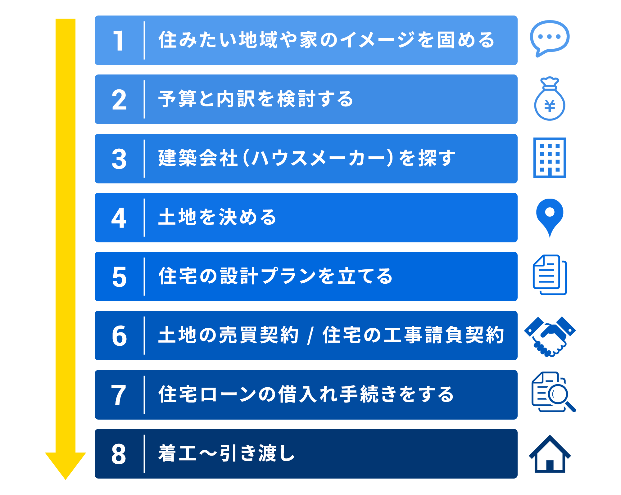 先にも述べたとおり、土地なしで家を建てる場合は工程も増えるため、その手順をしっかり把握しておくことが大切です。以下に、具体的な手順を紹介します。