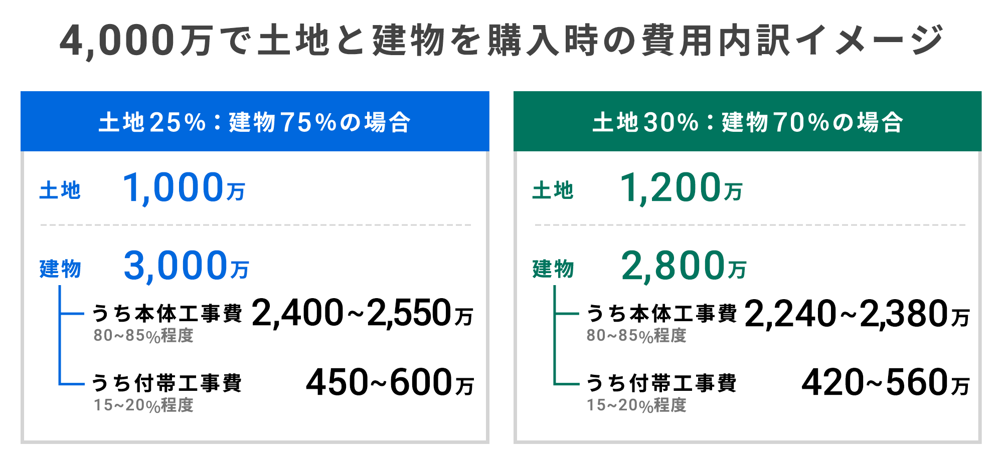 - 4000万円で土地と建物を購入する場合のイメージ例として、土地:建物の割合が全体の25%:75%の場合と、30%:70%の場合を紹介する。