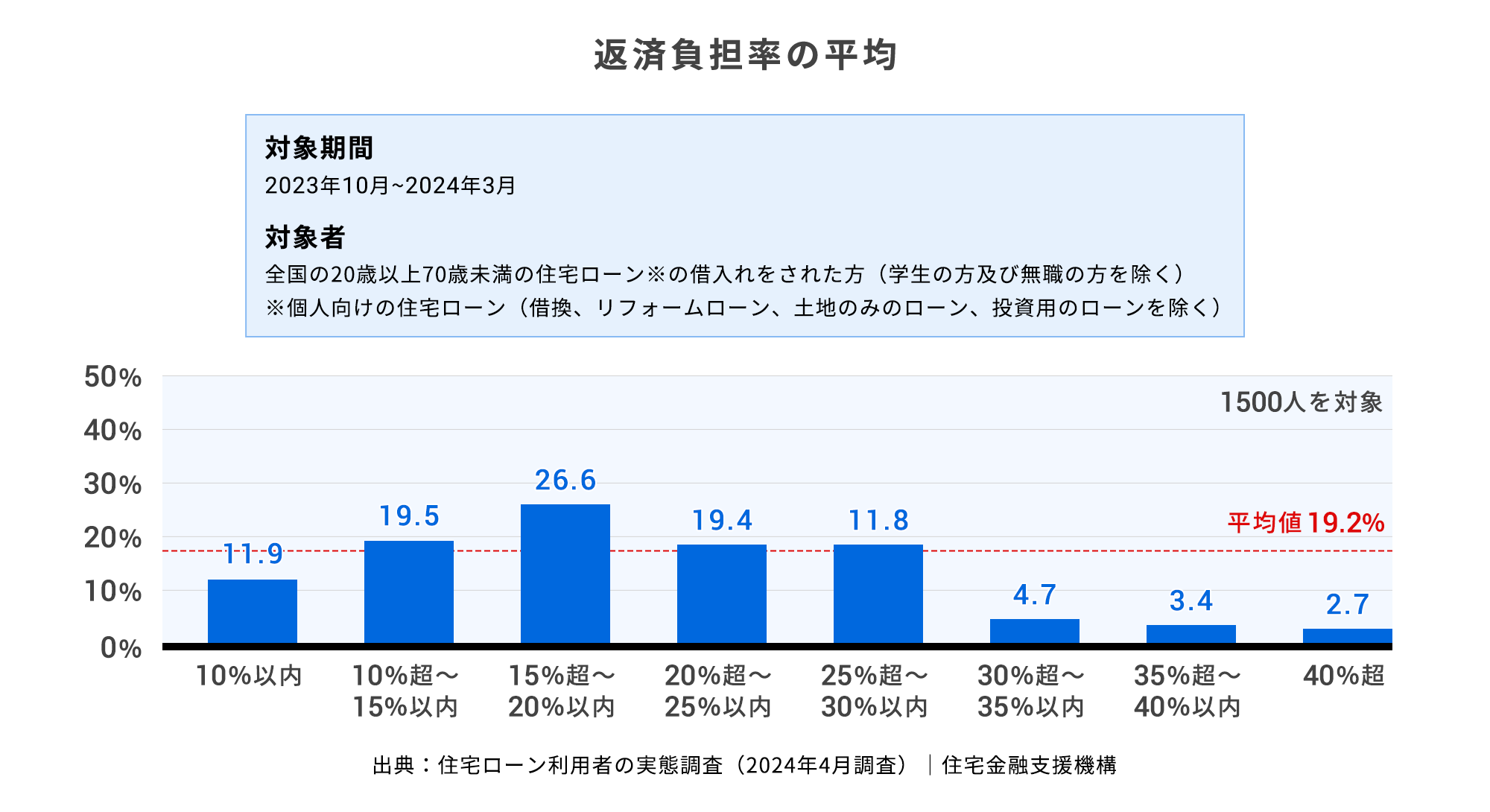 住宅金融支援機構による「住宅ローン利用者の実態調査【住宅ローン利用者調査(2024年4月調査)】」によると、最も多い返済負担率の層は「15%超~20%以内」でした。