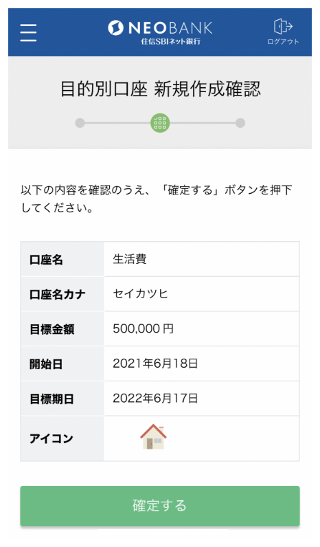 設定内容を確認して「確定する」を押します。いよいよ自動貯金が始まります!